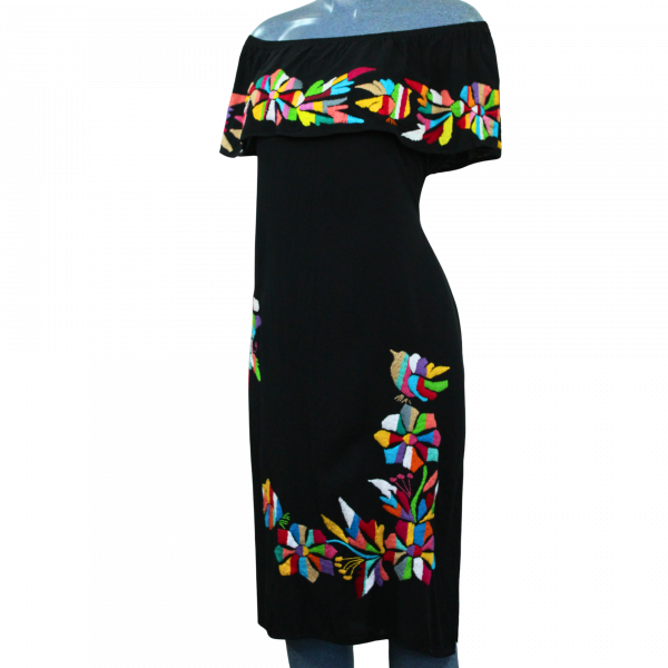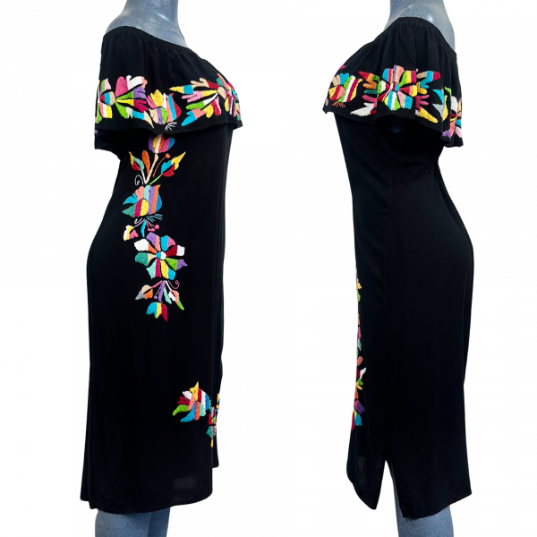Vestido de color negro con bordado multicolor Naxo Tojndi, Flor de Guasmole en Mazateco.